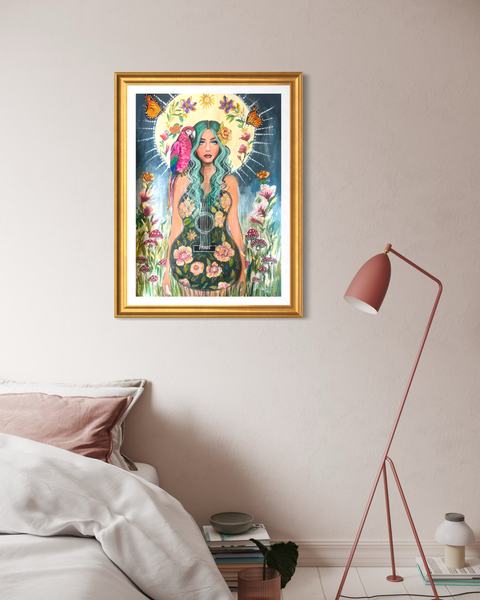 She stands surrounded by mushrooms, marigolds. monsteras and Magnolias. The glowing moon behind her, symbolises strength and resilience.
