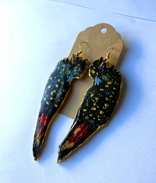The Red & Black Cockatoo earrings are inspired by my original artwork and handmade with love. Sculpted from polymer clay and carefully hand-painted. Finished with a glossy resin coat they’re lightweight and one of a kind. Available in small, medium and large.